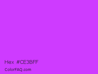 Hex #ce3bff Color is a light purple color and the nearest color is Steel Pink #cc33cc. Hex code #ce3bff and RGB value is rgb(206,59,255). In RGB color space, this color is composed of 81% red, 23% green, 100% blue, In CMYK color space, this color is composed of 19% cyan, 77% magenta, 0% yellow , 0% black , In HSL color space, this color has a hue angle of 285° , 100% saturation and 62% lightness.
