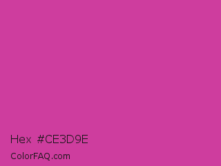 Hex #ce3d9e Color is a normal magenta color and the nearest color is Pink Pantone #d74894. Hex code #ce3d9e and RGB value is rgb(206,61,158). In RGB color space, this color is composed of 81% red, 24% green, 62% blue, In CMYK color space, this color is composed of 0% cyan, 70% magenta, 23% yellow , 19% black , In HSL color space, this color has a hue angle of 320° , 60% saturation and 52% lightness.