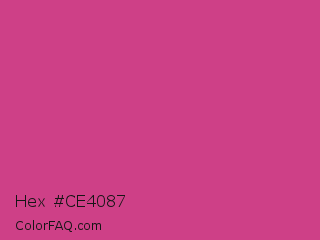 Hex #ce4087 Color is a normal rose color and the nearest color is Smitten #c84186. Hex code #ce4087 and RGB value is rgb(206,64,135). In RGB color space, this color is composed of 81% red, 25% green, 53% blue, In CMYK color space, this color is composed of 0% cyan, 69% magenta, 34% yellow , 19% black , In HSL color space, this color has a hue angle of 330° , 59% saturation and 53% lightness.