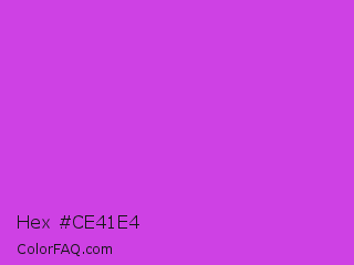 Hex #ce41e4 Color is a normal magenta color and the nearest color is Steel Pink #cc33cc. Hex code #ce41e4 and RGB value is rgb(206,65,228). In RGB color space, this color is composed of 81% red, 25% green, 89% blue, In CMYK color space, this color is composed of 10% cyan, 71% magenta, 0% yellow , 11% black , In HSL color space, this color has a hue angle of 292° , 75% saturation and 57% lightness.