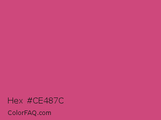 Hex #ce487c Color is a normal rose color and the nearest color is Ruber #ce4676. Hex code #ce487c and RGB value is rgb(206,72,124). In RGB color space, this color is composed of 81% red, 28% green, 49% blue, In CMYK color space, this color is composed of 0% cyan, 65% magenta, 40% yellow , 19% black , In HSL color space, this color has a hue angle of 337° , 58% saturation and 55% lightness.