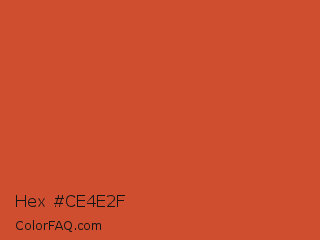 Hex #ce4e2f Color is a normal red color and the nearest color is Valencia #d84437. Hex code #ce4e2f and RGB value is rgb(206,78,47). In RGB color space, this color is composed of 81% red, 31% green, 18% blue, In CMYK color space, this color is composed of 0% cyan, 62% magenta, 77% yellow , 19% black , In HSL color space, this color has a hue angle of 12° , 63% saturation and 50% lightness.