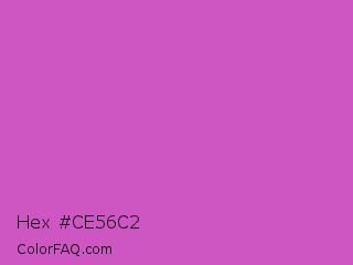 Hex #ce56c2 Color is a normal magenta color and the nearest color is Fuchsia Pink #c154c1. Hex code #ce56c2 and RGB value is rgb(206,86,194). In RGB color space, this color is composed of 81% red, 34% green, 76% blue, In CMYK color space, this color is composed of 0% cyan, 58% magenta, 6% yellow , 19% black , In HSL color space, this color has a hue angle of 306° , 55% saturation and 57% lightness.
