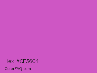 Hex #ce56c4 Color is a normal magenta color and the nearest color is Fuchsia Pink #c154c1. Hex code #ce56c4 and RGB value is rgb(206,86,196). In RGB color space, this color is composed of 81% red, 34% green, 77% blue, In CMYK color space, this color is composed of 0% cyan, 58% magenta, 5% yellow , 19% black , In HSL color space, this color has a hue angle of 305° , 55% saturation and 57% lightness.