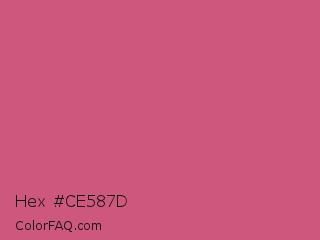 Hex #ce587d Color is a normal rose color and the nearest color is Cinnamon Satin #cd607e. Hex code #ce587d and RGB value is rgb(206,88,125). In RGB color space, this color is composed of 81% red, 35% green, 49% blue, In CMYK color space, this color is composed of 0% cyan, 57% magenta, 39% yellow , 19% black , In HSL color space, this color has a hue angle of 341° , 55% saturation and 58% lightness.