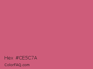 Hex #ce5c7a Color is a normal rose color and the nearest color is Cinnamon Satin #cd607e. Hex code #ce5c7a and RGB value is rgb(206,92,122). In RGB color space, this color is composed of 81% red, 36% green, 48% blue, In CMYK color space, this color is composed of 0% cyan, 55% magenta, 41% yellow , 19% black , In HSL color space, this color has a hue angle of 344° , 54% saturation and 58% lightness.