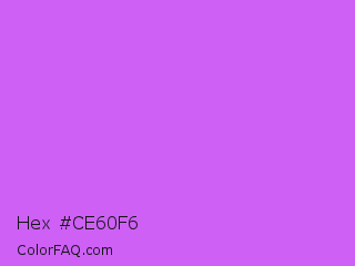 Hex #ce60f6 Color is a light purple color and the nearest color is Heliotrope #df73ff. Hex code #ce60f6 and RGB value is rgb(206,96,246). In RGB color space, this color is composed of 81% red, 38% green, 96% blue, In CMYK color space, this color is composed of 16% cyan, 61% magenta, 0% yellow , 4% black , In HSL color space, this color has a hue angle of 284° , 89% saturation and 67% lightness.