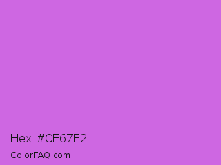 Hex #ce67e2 Color is a light purple color and the nearest color is Orchid #da70d6. Hex code #ce67e2 and RGB value is rgb(206,103,226). In RGB color space, this color is composed of 81% red, 40% green, 89% blue, In CMYK color space, this color is composed of 9% cyan, 54% magenta, 0% yellow , 11% black , In HSL color space, this color has a hue angle of 290° , 68% saturation and 65% lightness.
