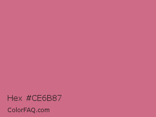 Hex #ce6b87 Color is a light rose color and the nearest color is Cinnamon Satin #cd607e. Hex code #ce6b87 and RGB value is rgb(206,107,135). In RGB color space, this color is composed of 81% red, 42% green, 53% blue, In CMYK color space, this color is composed of 0% cyan, 48% magenta, 34% yellow , 19% black , In HSL color space, this color has a hue angle of 343° , 50% saturation and 61% lightness.