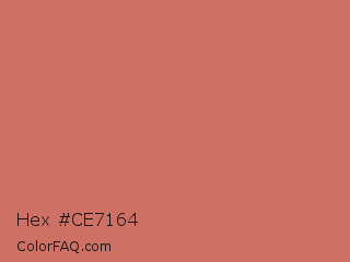 Hex #ce7164 Color is a normal red color and the nearest color is Contessa #c6726b. Hex code #ce7164 and RGB value is rgb(206,113,100). In RGB color space, this color is composed of 81% red, 44% green, 39% blue, In CMYK color space, this color is composed of 0% cyan, 45% magenta, 51% yellow , 19% black , In HSL color space, this color has a hue angle of 7° , 52% saturation and 60% lightness.