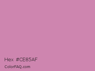 Hex #ce85af Color is a light magenta color and the nearest color is Viola #cb8fa9. Hex code #ce85af and RGB value is rgb(206,133,175). In RGB color space, this color is composed of 81% red, 52% green, 69% blue, In CMYK color space, this color is composed of 0% cyan, 35% magenta, 15% yellow , 19% black , In HSL color space, this color has a hue angle of 325° , 43% saturation and 66% lightness.