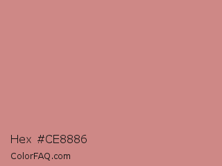 Hex #ce8886 Color is a light red color and the nearest color is My Pink #d69188. Hex code #ce8886 and RGB value is rgb(206,136,134). In RGB color space, this color is composed of 81% red, 53% green, 53% blue, In CMYK color space, this color is composed of 0% cyan, 34% magenta, 35% yellow , 19% black , In HSL color space, this color has a hue angle of 2° , 42% saturation and 67% lightness.