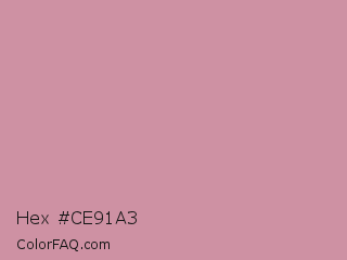 Hex #ce91a3 Color is a light rose color and the nearest color is Viola #cb8fa9. Hex code #ce91a3 and RGB value is rgb(206,145,163). In RGB color space, this color is composed of 81% red, 57% green, 64% blue, In CMYK color space, this color is composed of 0% cyan, 30% magenta, 21% yellow , 19% black , In HSL color space, this color has a hue angle of 342° , 38% saturation and 69% lightness.