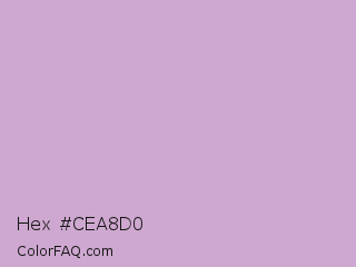 Hex #cea8d0 Color is a light magenta color and the nearest color is Lilac #c8a2c8. Hex code #cea8d0 and RGB value is rgb(206,168,208). In RGB color space, this color is composed of 81% red, 66% green, 82% blue, In CMYK color space, this color is composed of 1% cyan, 19% magenta, 0% yellow , 18% black , In HSL color space, this color has a hue angle of 297° , 30% saturation and 74% lightness.