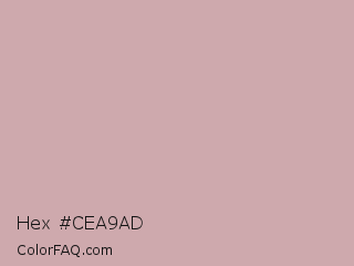 Hex #cea9ad Color is a light red color and the nearest color is Silver Pink #c4aead. Hex code #cea9ad and RGB value is rgb(206,169,173). In RGB color space, this color is composed of 81% red, 66% green, 68% blue, In CMYK color space, this color is composed of 0% cyan, 18% magenta, 16% yellow , 19% black , In HSL color space, this color has a hue angle of 354° , 27% saturation and 74% lightness.