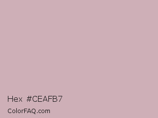 Hex #ceafb7 Color is a light red color and the nearest color is Lily #c8aabf. Hex code #ceafb7 and RGB value is rgb(206,175,183). In RGB color space, this color is composed of 81% red, 69% green, 72% blue, In CMYK color space, this color is composed of 0% cyan, 15% magenta, 11% yellow , 19% black , In HSL color space, this color has a hue angle of 345° , 24% saturation and 75% lightness.
