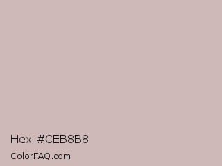 Hex #ceb8b8 Color is a light red color and the nearest color is Cold Turkey #cebaba. Hex code #ceb8b8 and RGB value is rgb(206,184,184). In RGB color space, this color is composed of 81% red, 72% green, 72% blue, In CMYK color space, this color is composed of 0% cyan, 11% magenta, 11% yellow , 19% black , In HSL color space, this color has a hue angle of 0° , 18% saturation and 76% lightness.