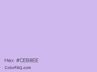 Hex #ceb8ee Color is a very light violet color and the nearest color is Perfume #d0bef8. Hex code #ceb8ee and RGB value is rgb(206,184,238). In RGB color space, this color is composed of 81% red, 72% green, 93% blue, In CMYK color space, this color is composed of 13% cyan, 23% magenta, 0% yellow , 7% black , In HSL color space, this color has a hue angle of 264° , 61% saturation and 83% lightness.