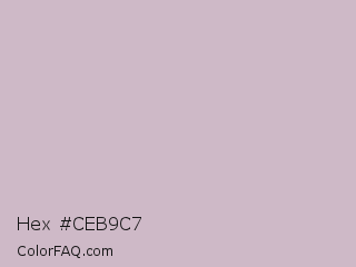 Hex #ceb9c7 Color is a light magenta color and the nearest color is Cold Turkey #cebaba. Hex code #ceb9c7 and RGB value is rgb(206,185,199). In RGB color space, this color is composed of 81% red, 73% green, 78% blue, In CMYK color space, this color is composed of 0% cyan, 10% magenta, 3% yellow , 19% black , In HSL color space, this color has a hue angle of 320° , 18% saturation and 77% lightness.
