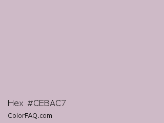 Hex #cebac7 Color is a light magenta color and the nearest color is Cold Turkey #cebaba. Hex code #cebac7 and RGB value is rgb(206,186,199). In RGB color space, this color is composed of 81% red, 73% green, 78% blue, In CMYK color space, this color is composed of 0% cyan, 10% magenta, 3% yellow , 19% black , In HSL color space, this color has a hue angle of 321° , 17% saturation and 77% lightness.