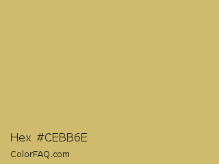 Hex #cebb6e Color is a light yellow color and the nearest color is Laser #c8b568. Hex code #cebb6e and RGB value is rgb(206,187,110). In RGB color space, this color is composed of 81% red, 73% green, 43% blue, In CMYK color space, this color is composed of 0% cyan, 9% magenta, 47% yellow , 19% black , In HSL color space, this color has a hue angle of 48° , 49% saturation and 62% lightness.
