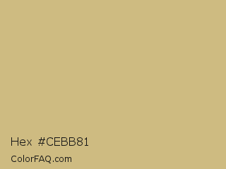 Hex #cebb81 Color is a light orange color and the nearest color is Tan #d2b48c. Hex code #cebb81 and RGB value is rgb(206,187,129). In RGB color space, this color is composed of 81% red, 73% green, 51% blue, In CMYK color space, this color is composed of 0% cyan, 9% magenta, 37% yellow , 19% black , In HSL color space, this color has a hue angle of 45° , 44% saturation and 66% lightness.