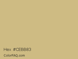 Hex #cebb83 Color is a light orange color and the nearest color is Tan #d2b48c. Hex code #cebb83 and RGB value is rgb(206,187,131). In RGB color space, this color is composed of 81% red, 73% green, 51% blue, In CMYK color space, this color is composed of 0% cyan, 9% magenta, 36% yellow , 19% black , In HSL color space, this color has a hue angle of 45° , 43% saturation and 66% lightness.
