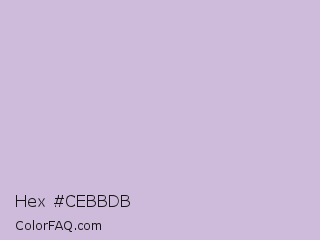 Hex #cebbdb Color is a light purple color and the nearest color is Thistle #d8bfd8. Hex code #cebbdb and RGB value is rgb(206,187,219). In RGB color space, this color is composed of 81% red, 73% green, 86% blue, In CMYK color space, this color is composed of 6% cyan, 15% magenta, 0% yellow , 14% black , In HSL color space, this color has a hue angle of 276° , 31% saturation and 80% lightness.