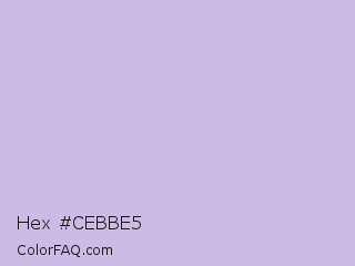 Hex #cebbe5 Color is a very light violet color and the nearest color is Prelude #d0c0e5. Hex code #cebbe5 and RGB value is rgb(206,187,229). In RGB color space, this color is composed of 81% red, 73% green, 90% blue, In CMYK color space, this color is composed of 10% cyan, 18% magenta, 0% yellow , 10% black , In HSL color space, this color has a hue angle of 267° , 45% saturation and 82% lightness.
