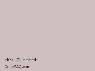 Hex #cebebf Color is a light red color and the nearest color is Cold Turkey #cebaba. Hex code #cebebf and RGB value is rgb(206,190,191). In RGB color space, this color is composed of 81% red, 75% green, 75% blue, In CMYK color space, this color is composed of 0% cyan, 8% magenta, 7% yellow , 19% black , In HSL color space, this color has a hue angle of 356° , 14% saturation and 78% lightness.
