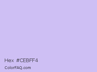 Hex #cebff4 Color is a very light indigo color and the nearest color is Perfume #d0bef8. Hex code #cebff4 and RGB value is rgb(206,191,244). In RGB color space, this color is composed of 81% red, 75% green, 96% blue, In CMYK color space, this color is composed of 16% cyan, 22% magenta, 0% yellow , 4% black , In HSL color space, this color has a hue angle of 257° , 71% saturation and 85% lightness.