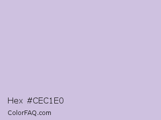 Hex #cec1e0 Color is a very light violet color and the nearest color is Prelude #d0c0e5. Hex code #cec1e0 and RGB value is rgb(206,193,224). In RGB color space, this color is composed of 81% red, 76% green, 88% blue, In CMYK color space, this color is composed of 8% cyan, 14% magenta, 0% yellow , 12% black , In HSL color space, this color has a hue angle of 265° , 33% saturation and 82% lightness.