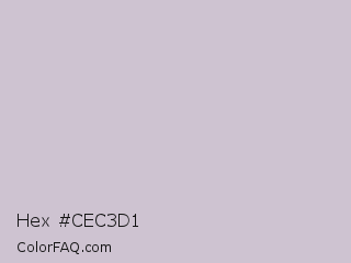 Hex #cec3d1 Color is a light purple color and the nearest color is Lavender Gray #c4c3d0. Hex code #cec3d1 and RGB value is rgb(206,195,209). In RGB color space, this color is composed of 81% red, 76% green, 82% blue, In CMYK color space, this color is composed of 1% cyan, 7% magenta, 0% yellow , 18% black , In HSL color space, this color has a hue angle of 287° , 13% saturation and 79% lightness.