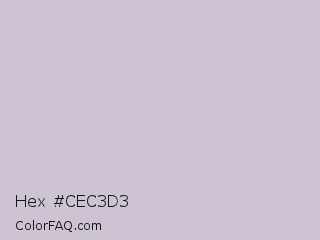 Hex #cec3d3 Color is a light purple color and the nearest color is Ghost #c7c9d5. Hex code #cec3d3 and RGB value is rgb(206,195,211). In RGB color space, this color is composed of 81% red, 76% green, 83% blue, In CMYK color space, this color is composed of 2% cyan, 8% magenta, 0% yellow , 17% black , In HSL color space, this color has a hue angle of 281° , 15% saturation and 80% lightness.