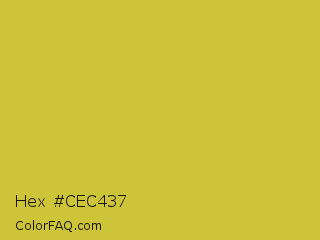 Hex #cec437 Color is a normal yellow color and the nearest color is Earls Green #c9b93b. Hex code #cec437 and RGB value is rgb(206,196,55). In RGB color space, this color is composed of 81% red, 77% green, 22% blue, In CMYK color space, this color is composed of 0% cyan, 5% magenta, 73% yellow , 19% black , In HSL color space, this color has a hue angle of 56° , 61% saturation and 51% lightness.