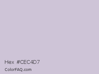 Hex #cec4d7 Color is a very light purple color and the nearest color is Ghost #c7c9d5. Hex code #cec4d7 and RGB value is rgb(206,196,215). In RGB color space, this color is composed of 81% red, 77% green, 84% blue, In CMYK color space, this color is composed of 4% cyan, 9% magenta, 0% yellow , 16% black , In HSL color space, this color has a hue angle of 272° , 19% saturation and 81% lightness.