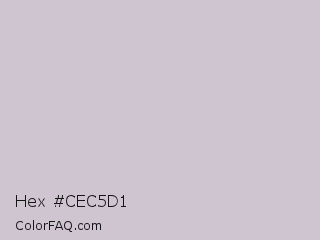 Hex #cec5d1 Color is a light purple color and the nearest color is Ghost #c7c9d5. Hex code #cec5d1 and RGB value is rgb(206,197,209). In RGB color space, this color is composed of 81% red, 77% green, 82% blue, In CMYK color space, this color is composed of 1% cyan, 6% magenta, 0% yellow , 18% black , In HSL color space, this color has a hue angle of 285° , 12% saturation and 80% lightness.
