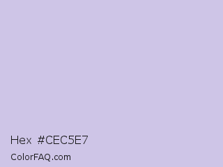 Hex #cec5e7 Color is a very light indigo color and the nearest color is Prelude #d0c0e5. Hex code #cec5e7 and RGB value is rgb(206,197,231). In RGB color space, this color is composed of 81% red, 77% green, 91% blue, In CMYK color space, this color is composed of 11% cyan, 15% magenta, 0% yellow , 9% black , In HSL color space, this color has a hue angle of 256° , 41% saturation and 84% lightness.