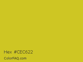 Hex #cec622 Color is a normal yellow color and the nearest color is Bird Flower #d4cd16. Hex code #cec622 and RGB value is rgb(206,198,34). In RGB color space, this color is composed of 81% red, 78% green, 13% blue, In CMYK color space, this color is composed of 0% cyan, 4% magenta, 83% yellow , 19% black , In HSL color space, this color has a hue angle of 57° , 72% saturation and 47% lightness.