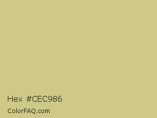 Hex #cec986 Color is a light yellow color and the nearest color is Pine Glade #c7cd90. Hex code #cec986 and RGB value is rgb(206,201,134). In RGB color space, this color is composed of 81% red, 79% green, 53% blue, In CMYK color space, this color is composed of 0% cyan, 2% magenta, 35% yellow , 19% black , In HSL color space, this color has a hue angle of 56° , 42% saturation and 67% lightness.