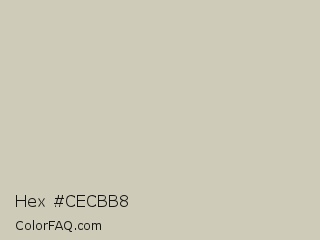 Hex #cecbb8 Color is a light yellow color and the nearest color is Foggy Gray #cbcab6. Hex code #cecbb8 and RGB value is rgb(206,203,184). In RGB color space, this color is composed of 81% red, 80% green, 72% blue, In CMYK color space, this color is composed of 0% cyan, 1% magenta, 11% yellow , 19% black , In HSL color space, this color has a hue angle of 52° , 18% saturation and 76% lightness.