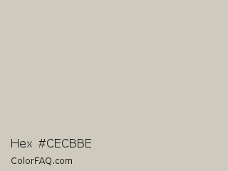 Hex #cecbbe Color is a light yellow color and the nearest color is Sisal #d3cbba. Hex code #cecbbe and RGB value is rgb(206,203,190). In RGB color space, this color is composed of 81% red, 80% green, 75% blue, In CMYK color space, this color is composed of 0% cyan, 1% magenta, 8% yellow , 19% black , In HSL color space, this color has a hue angle of 49° , 14% saturation and 78% lightness.