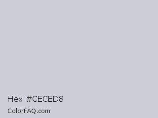 Hex #ceced8 Color is a very light blue color and the nearest color is Mischka #d1d2dd. Hex code #ceced8 and RGB value is rgb(206,206,216). In RGB color space, this color is composed of 81% red, 81% green, 85% blue, In CMYK color space, this color is composed of 5% cyan, 5% magenta, 0% yellow , 15% black , In HSL color space, this color has a hue angle of 240° , 11% saturation and 83% lightness.