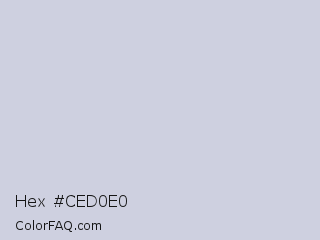 Hex #ced0e0 Color is a very light blue color and the nearest color is Mischka #d1d2dd. Hex code #ced0e0 and RGB value is rgb(206,208,224). In RGB color space, this color is composed of 81% red, 82% green, 88% blue, In CMYK color space, this color is composed of 8% cyan, 7% magenta, 0% yellow , 12% black , In HSL color space, this color has a hue angle of 233° , 23% saturation and 84% lightness.