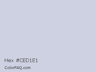 Hex #ced1e1 Color is a very light blue color and the nearest color is Mischka #d1d2dd. Hex code #ced1e1 and RGB value is rgb(206,209,225). In RGB color space, this color is composed of 81% red, 82% green, 88% blue, In CMYK color space, this color is composed of 8% cyan, 7% magenta, 0% yellow , 12% black , In HSL color space, this color has a hue angle of 231° , 24% saturation and 85% lightness.