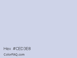 Hex #ced3e8 Color is a very light blue color and the nearest color is Mischka #d1d2dd. Hex code #ced3e8 and RGB value is rgb(206,211,232). In RGB color space, this color is composed of 81% red, 83% green, 91% blue, In CMYK color space, this color is composed of 11% cyan, 9% magenta, 0% yellow , 9% black , In HSL color space, this color has a hue angle of 228° , 36% saturation and 86% lightness.