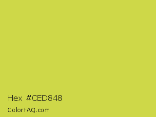 Hex #ced848 Color is a normal yellow color and the nearest color is Wattle #dcd747. Hex code #ced848 and RGB value is rgb(206,216,72). In RGB color space, this color is composed of 81% red, 85% green, 28% blue, In CMYK color space, this color is composed of 5% cyan, 0% magenta, 67% yellow , 15% black , In HSL color space, this color has a hue angle of 64° , 65% saturation and 56% lightness.