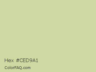 Hex #ced9a1 Color is a light lime color and the nearest color is Deco #d2da97. Hex code #ced9a1 and RGB value is rgb(206,217,161). In RGB color space, this color is composed of 81% red, 85% green, 63% blue, In CMYK color space, this color is composed of 5% cyan, 0% magenta, 26% yellow , 15% black , In HSL color space, this color has a hue angle of 72° , 42% saturation and 74% lightness.