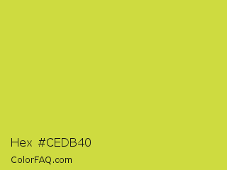 Hex #cedb40 Color is a normal yellow color and the nearest color is Wattle #dcd747. Hex code #cedb40 and RGB value is rgb(206,219,64). In RGB color space, this color is composed of 81% red, 86% green, 25% blue, In CMYK color space, this color is composed of 6% cyan, 0% magenta, 71% yellow , 14% black , In HSL color space, this color has a hue angle of 65° , 68% saturation and 55% lightness.