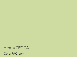 Hex #cedca1 Color is a light lime color and the nearest color is Deco #d2da97. Hex code #cedca1 and RGB value is rgb(206,220,161). In RGB color space, this color is composed of 81% red, 86% green, 63% blue, In CMYK color space, this color is composed of 6% cyan, 0% magenta, 27% yellow , 14% black , In HSL color space, this color has a hue angle of 74° , 46% saturation and 75% lightness.